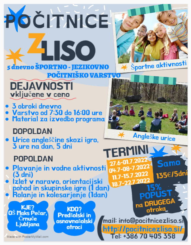 Nudimo poletno počitniško varstvo za osnovno šolce ter predšolske otroke v Črnučah (Ljubljana). V dopoldanskem času bodo potekale urice angleščine na zabaven način, kjer bo otrokom predstavljen jezik skozi igro in družabne aktivnosti. Popoldan bomo dan preživeli na bazenu mestne plaže Laguna, z organizirano animacijo v vodi in na kopnem. Odpravili se bomo tudi na izlet v naravo, kjer se bodo otroci soočili z orientacijskim tekom in skupinskimi igrami. Druge aktivnosti kot rolanje in kolesarjenje bodo organizirane eden izmed dni.